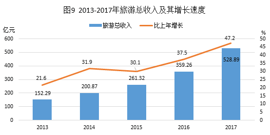 全年接待国内外游客人数5454.87万人次,比上年增长37.0%;其中,境外旅游人数63.65万人次,增长45.5%。旅游总收入528.89亿元,增长47.2%;其中,旅游创汇2.85亿美元,增长47.3%。