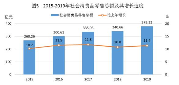 全年社会消费品零售总额379.33亿元,比上年增长11.4%。按经营地统计,城镇消费品零售额322.43亿元,增长11.6%;乡村消费品零售额56.90亿元,增长11.0%。按消费类型统计,商品零售额247.29亿元,增长15.2%;餐饮收入额85.79亿元,增长13.4%。