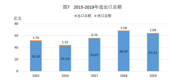 全年货物进出口总额64.30亿元,比上年下降6.2%。其中,出口63.21亿元,下降5.6%;进口1.09亿元,下降31.0%。进出口差额(出口减进口)62.12亿元。生产型出口总额49.15亿元,下降17.0%。
