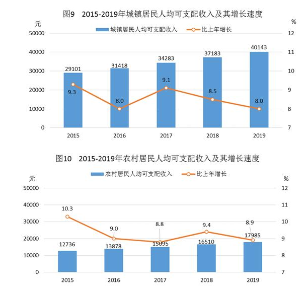全年城镇居民人均可支配收入40143元,比上年增长8.0%;农村居民人均可支配收入17985元,增长8.9%。城镇居民人均消费支出24878元,增长8.8%;农村居民人均消费支出14010元,增长15.8%。