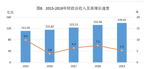 全年财政总收入139.42亿元,比上年增长5.3%;一般公共预算收入99.69亿元,增长10.9%。在财政总收入中,税收收入102.31亿元,增长2.3%,税收收入占比73.4%。