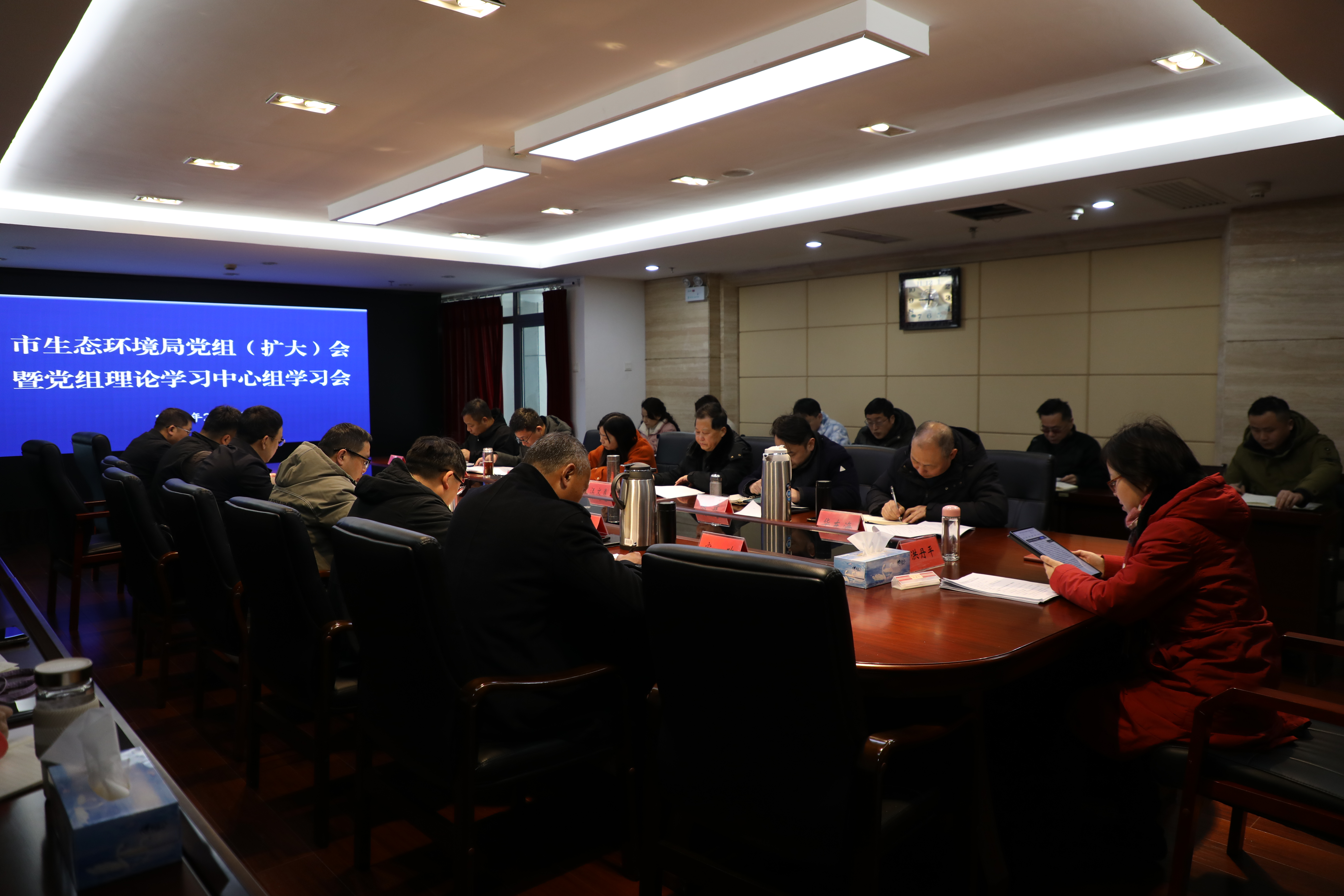 2月2日,市生态环境局召开党组理论学习中心组(扩大)会,专题传达学习省市两会精神。党组书记、局长洪丹平主持会议并讲话,局领导班子成员、执法支队长、四级调研员出席会议。