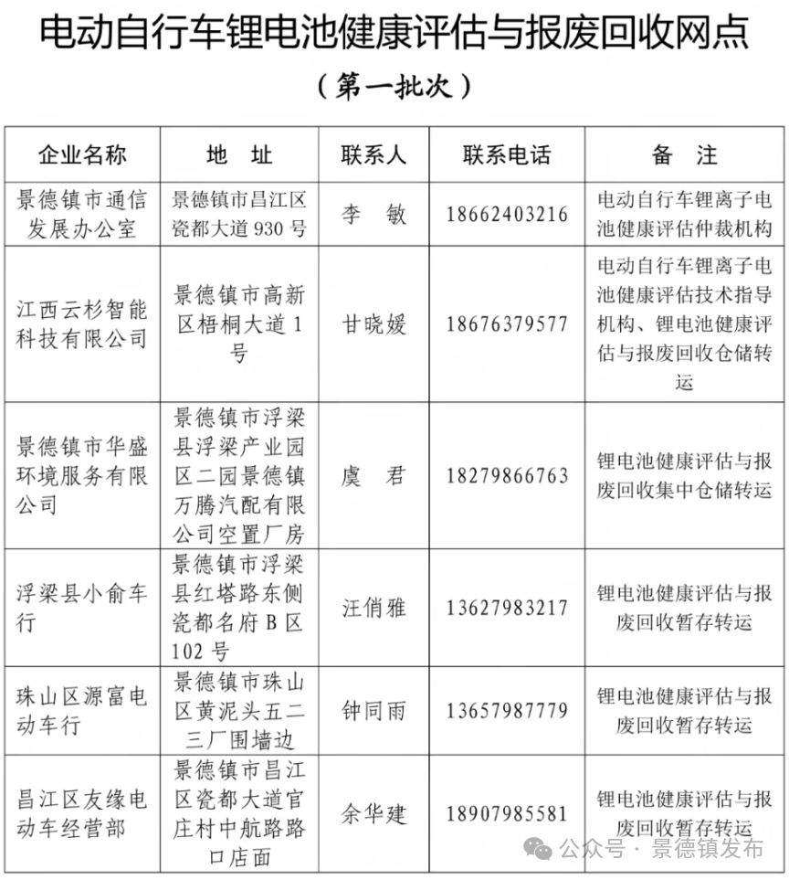 现将景德镇市3家电动自行车锂离子电池健康评估及报废回收暂存转运网点、1家景德镇市电动自行车锂离子电池健康评估与报废回收仓储转运网点(市级)、1家景德镇市电动自行车锂离子电池健康评估技术指导机构(市级)、1家景德镇市电动自行车锂离子电池健康评估仲裁机构(市级)进行公告,辖区内群众可根据实际需求,就近选择服务网点和机构。具体信息如下: