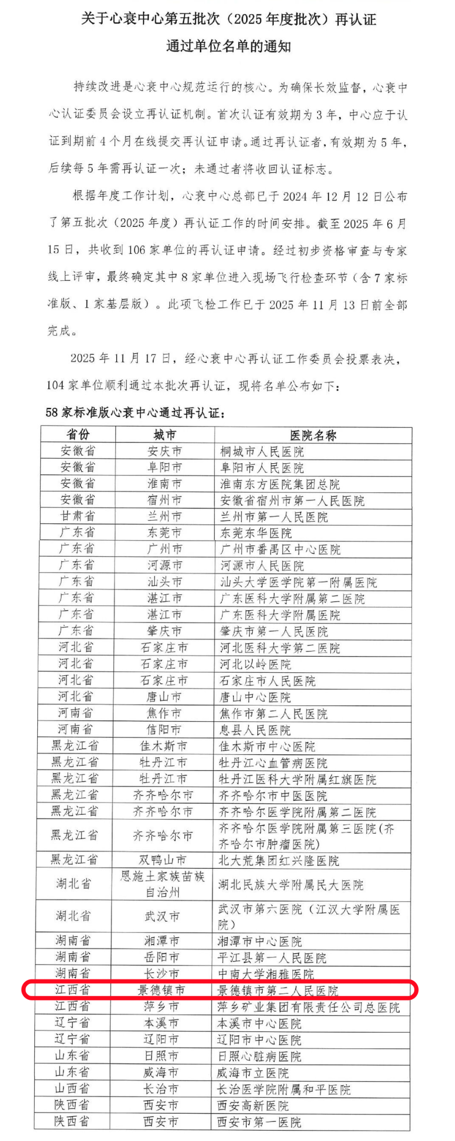 11月17日,中国心血管健康联盟(CCA)心衰中心发布《关于心衰中心第五批次(2025年度批次)再认证通过单位名单的通知》,景德镇市第二人民医院顺利通过了心衰中心国家标准版再认证。这标志着市二院在心衰规范化诊疗、多学科协作及患者全周期管理等方面已达省内先进水平,为瓷都百姓心血管健康提供更坚实的保障。