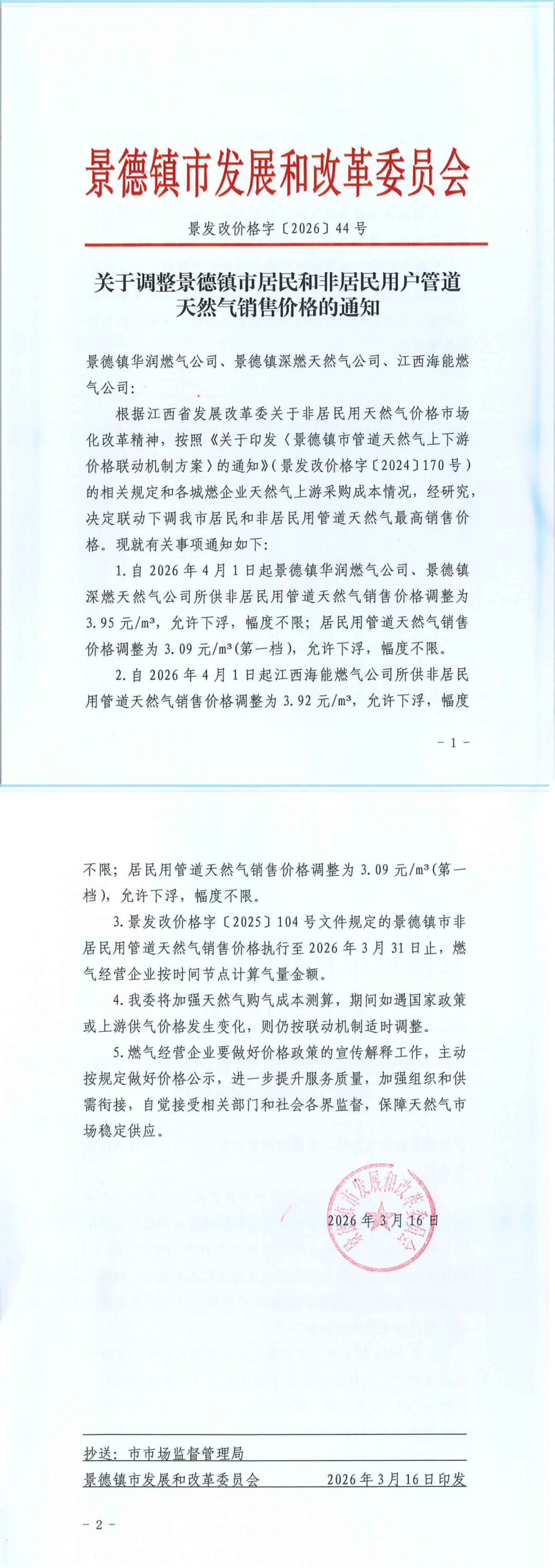 附件:《景发改价格字【2026】44号 关于调整景德镇市居民和非居民用户管道天然气销售价格的通知》