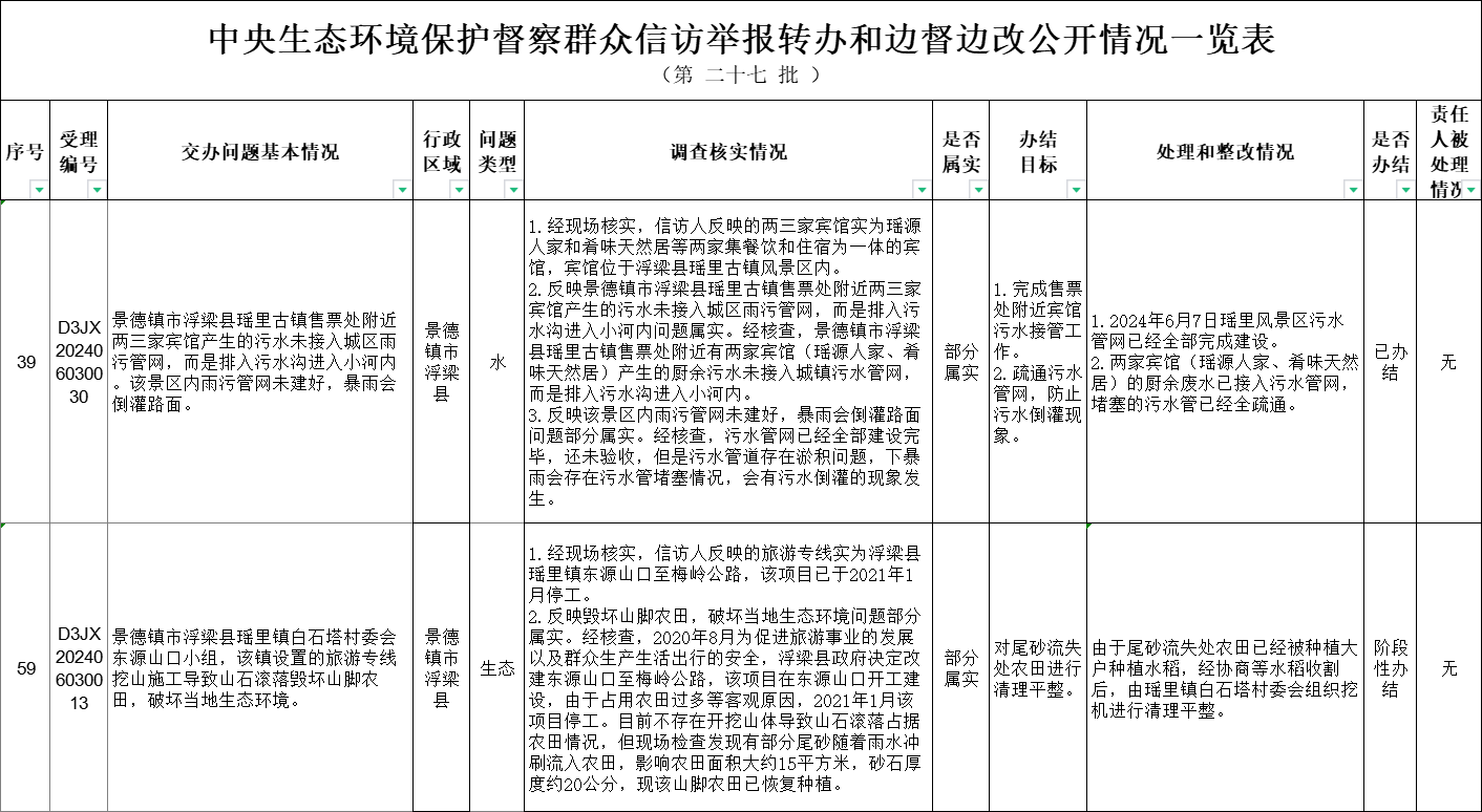 截至6月13日,对中央第三生态环境保护督察组向景德镇市移交的第二十七批群众信访举报件2件,各责任单位均按要求上报调查处理情况。根据督察要求,群众信访举报转办和边督边改公开情况一览表将在报纸、网站等媒体上公布。