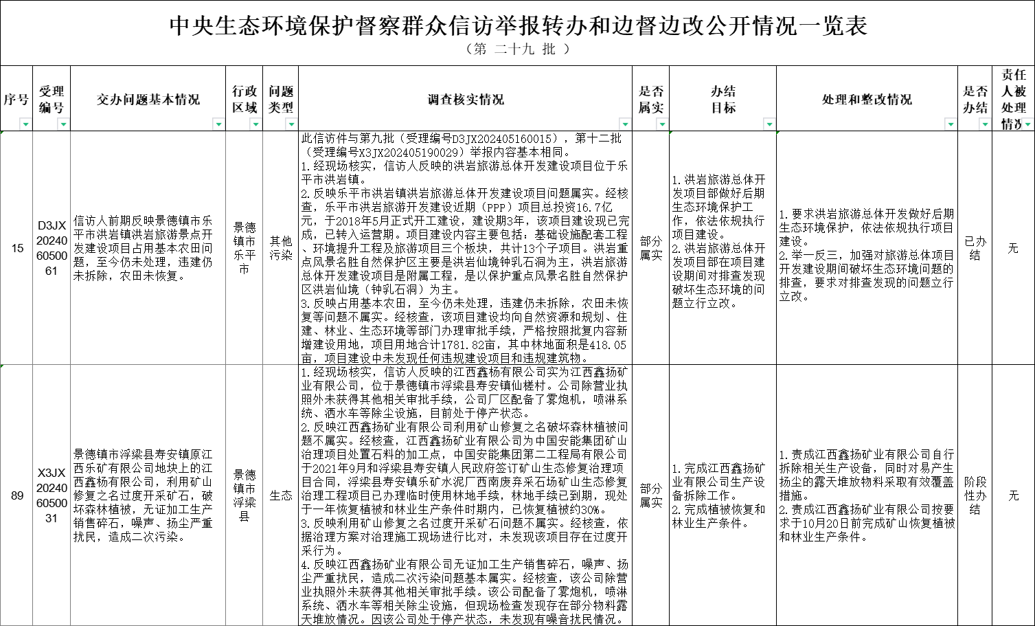 截至6月15日,对中央第三生态环境保护督察组向景德镇市移交的第二十九批群众信访举报件2件,各责任单位均按要求上报调查处理情况。根据督察要求,群众信访举报转办和边督边改公开情况一览表将在报纸、网站等媒体上公布。