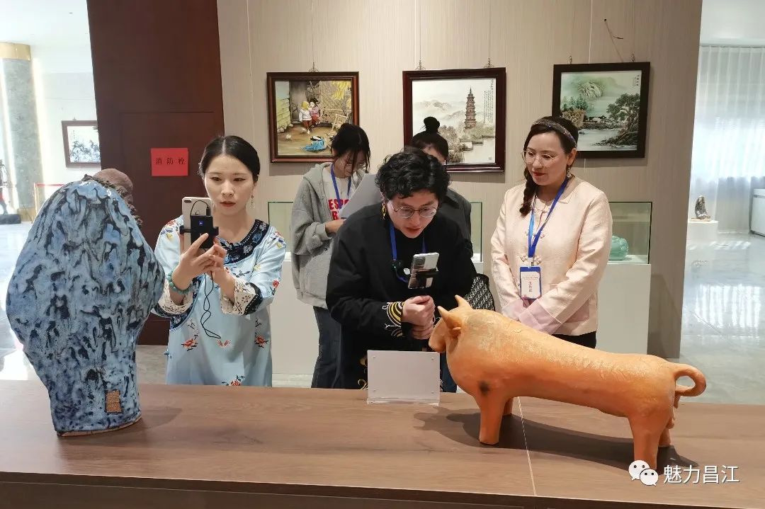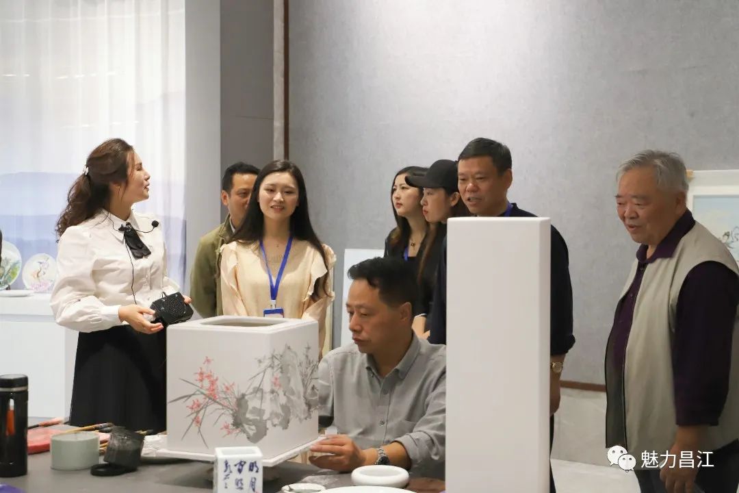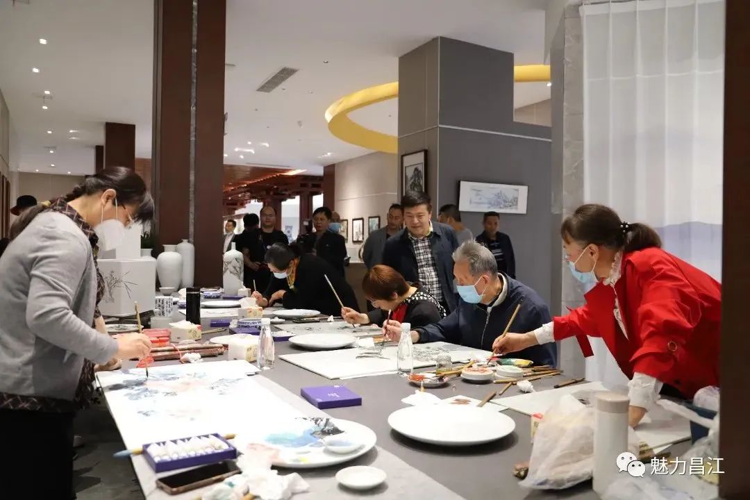 现场,陶瓷书画艺术家挥毫泼墨,进行交流创作,共绘昌江美景,讴歌瓷都风貌。