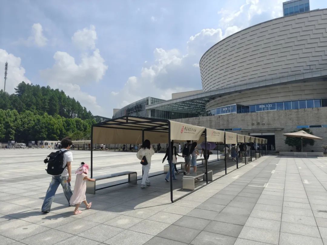 在广场区域,从西门进口到入馆检票口,新增多把大型遮阳伞,为排队入馆的游客撑起一片清凉,有效遮挡炎炎烈日。同时在游客入馆等待区域启动了喷雾系统,让大家在等待过程中免受高温之苦。