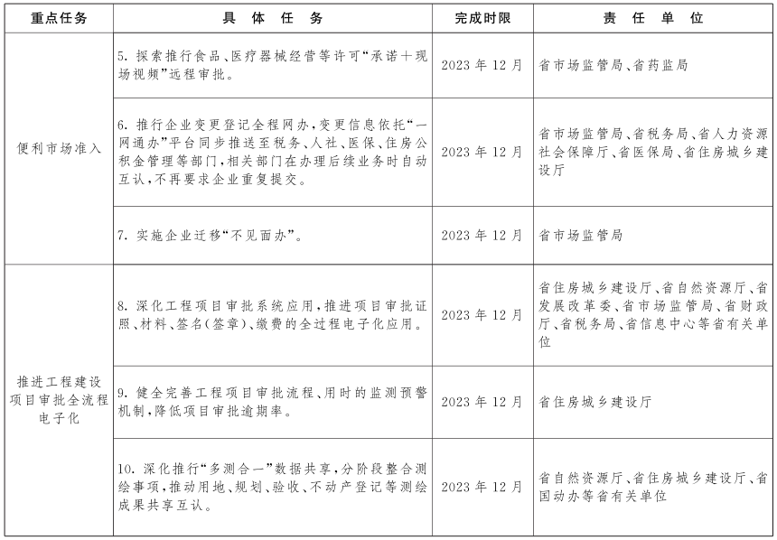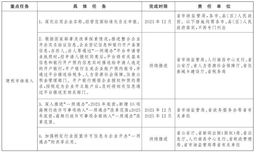 一、便利市场准入。深化应用企业名称、经营范围标准化自主申报。探索整合企业开办和银行开户备案信息,进一步便利开立银行账户。深入推进“一照通办”,推动跨部门更多行政许可事项纳入“一照通办”改革范围。加强特定行业前置许可信息与企业开办“一网通办”的共享应用。探索推行食品、医疗器械经营等许可“承诺+现场视频”远程审批。推行企业变更登记全程网办,实施企业迁移“不见面办”。(责任单位:省市场监管局、省公安厅、省税务局、省人力资源社会保障厅、省医保局、省住房城乡建设厅、人行南昌中心支行、省药监局等省有关单位,各市、县〔区〕人民政府。以下措施均需各市、县〔区〕人民政府落实,不再专门列出)