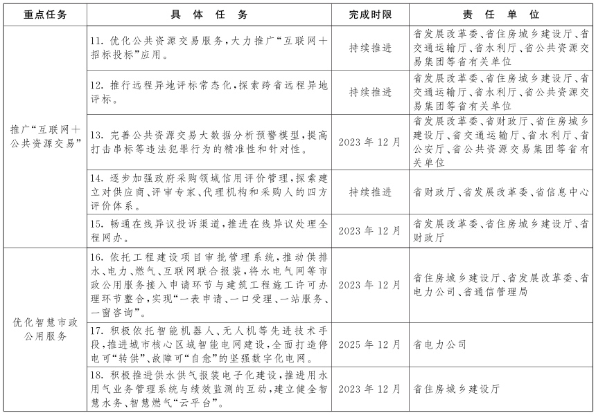 三、推广“互联网+公共资源交易”。优化公共资源交易服务,大力推广“互联网+招标投标”应用。推行远程异地评标常态化,探索跨省远程异地评标。完善公共资源交易大数据分析预警模型,提高打击串标等违法犯罪行为的精准性和针对性。逐步加强政府采购领域信用评价管理,探索建立对供应商、评审专家、代理机构和采购人的四方评价体系。畅通在线异议投诉渠道,推进在线异议处理全程网办。(责任单位:省发展改革委、省财政厅、省住房城乡建设厅、省交通运输厅、省水利厅、省公安厅、省公共资源交易集团等省有关单位)
