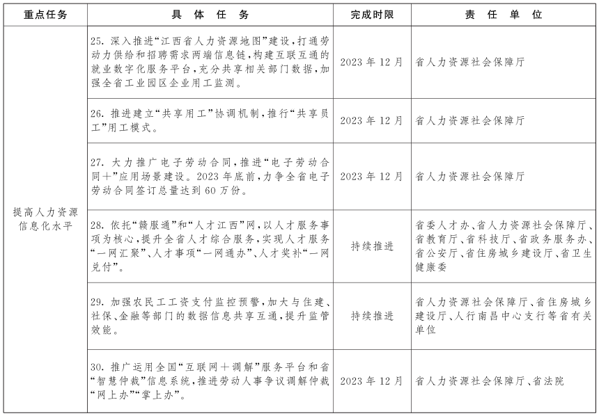 六、提高人力资源信息化水平。深入推进“江西省人力资源地图”建设,构建互联互通的就业数字化服务平台,加强工业园区企业用工监测。推进建立“共享用工”协调机制,推行“共享员工”用工模式。大力推广电子劳动合同,推进“电子劳动合同+”应用场景建设。依托“赣服通”和“人才江西”网,以人才服务事项为核心,提升全省人才综合服务,实现人才服务“一网汇聚”、人才事项“一网通办”、人才奖补“一网兑付”。加强农民工工资支付监控预警,保障农民工合法权益。推广运用全国“互联网+调解”服务平台和省“智慧仲裁”信息系统,推进劳动人事争议调解仲裁“网上办”“掌上办”。(责任单位:省人力资源社会保障厅、省委人才办、省法院、省教育厅、省科技厅、省政务服务办、省公安厅、省卫生健康委、省住房城乡建设厅、人行南昌中心支行等省有关单位)