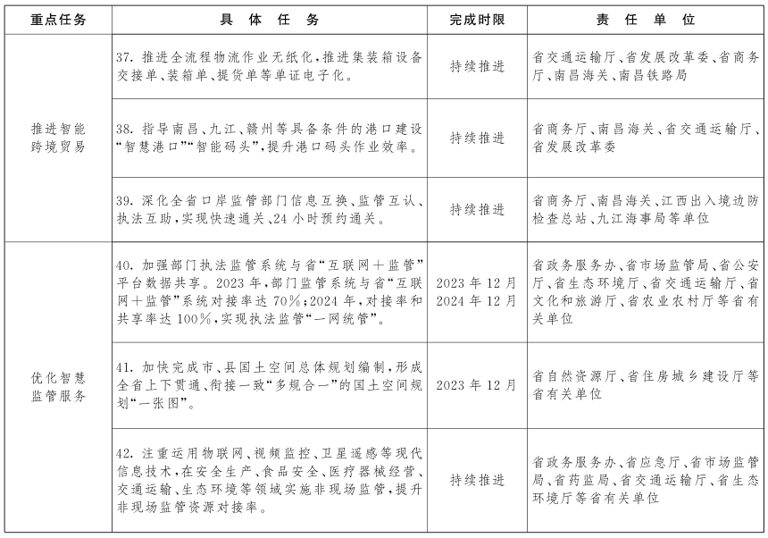 九、推进智能跨境贸易。推动国际贸易“单一窗口”服务功能由口岸通关向口岸物流、贸易服务等全链条拓展。推进全流程物流作业无纸化。指导南昌、九江、赣州等具备条件的港口建设“智慧港口”“智能码头”,提升港口码头作业效率。深化全省口岸监管部门信息互换、监管互认、执法互助,实现快速通关、24小时预约通关。(责任单位:省商务厅、南昌海关、省交通运输厅、省发展改革委、省公安厅、省工业和信息化厅、省自然资源厅、省生态环境厅、省农业农村厅、省科技厅、省市场监管局、省林业局、省广播电视局、省新闻出版〔版权〕局、省税务局、人行南昌中心支行、省贸促会、南昌铁路局、江西出入境边防检查总站、九江海事局)
