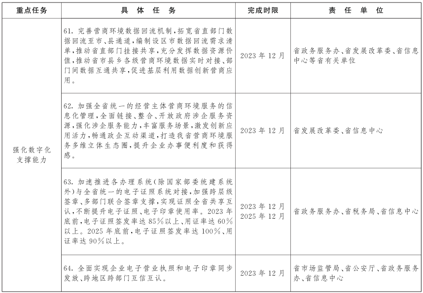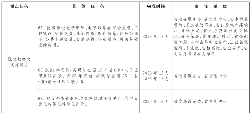 十五、强化数字化支撑能力。加强全省一体化政务大数据体系建设,加快推进省级数据共享平台能力提升,推动省市县三级数据汇聚联动,实现“按需归集、应归尽归”。加强全省统一的经营主体营商环境服务的信息化管理,全面链接、整合、开放政府涉企服务资源,丰富涉企服务场景。推进电子证照、电子印章在市场监管、工程建设、纳税缴费、社会保障、医疗保障、住房公积金、公共资源交易、交通运输、金融服务、司法等领域的应用。(责任单位:省政务服务办、省发展改革委、省市场监管局、省住房城乡建设厅、省税务局、省人力资源社会保障厅、省医保局、省交通运输厅、省金融监管局、人行南昌中心支行、江西银保监局、省法院、省检察院、省公安厅、省司法厅等省有关单位)