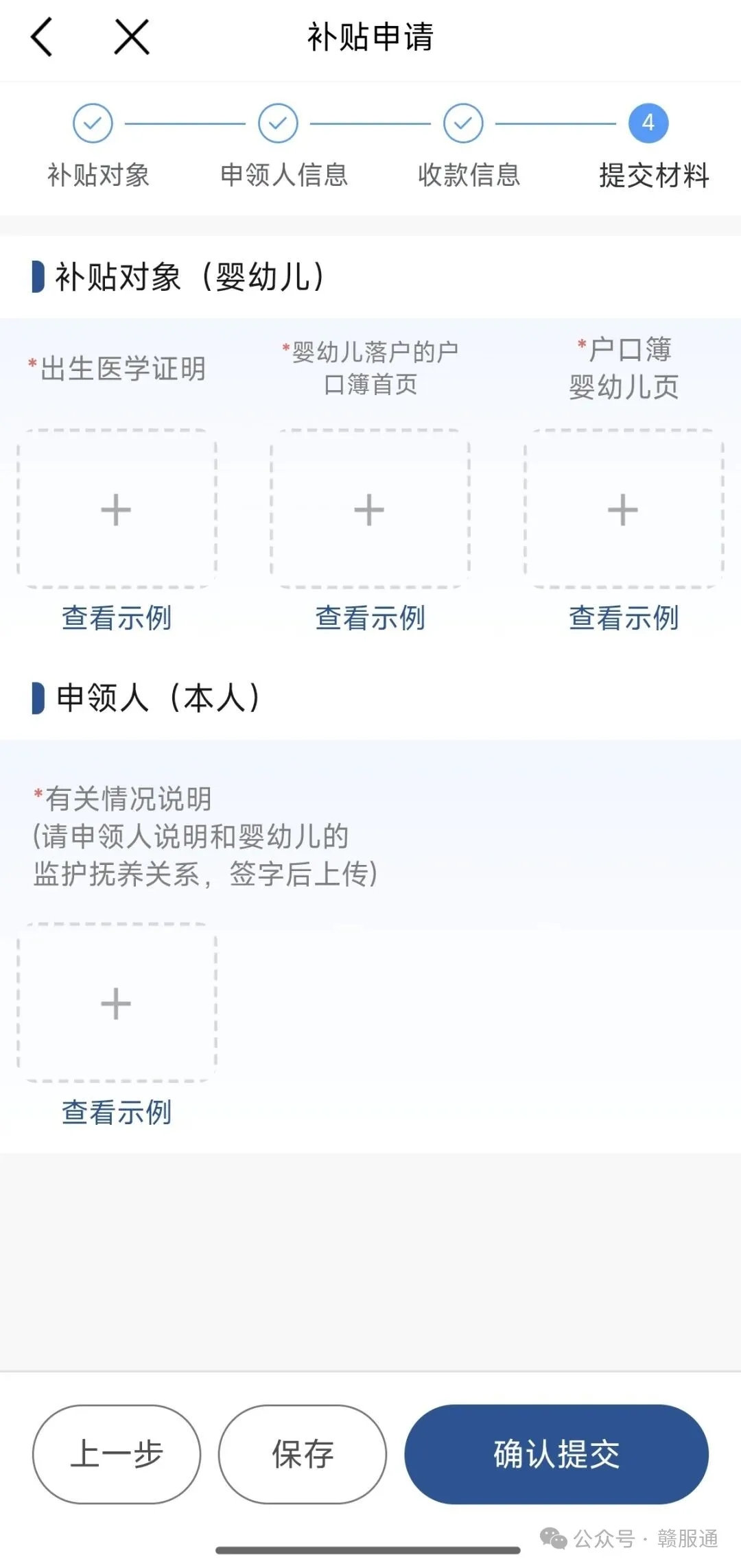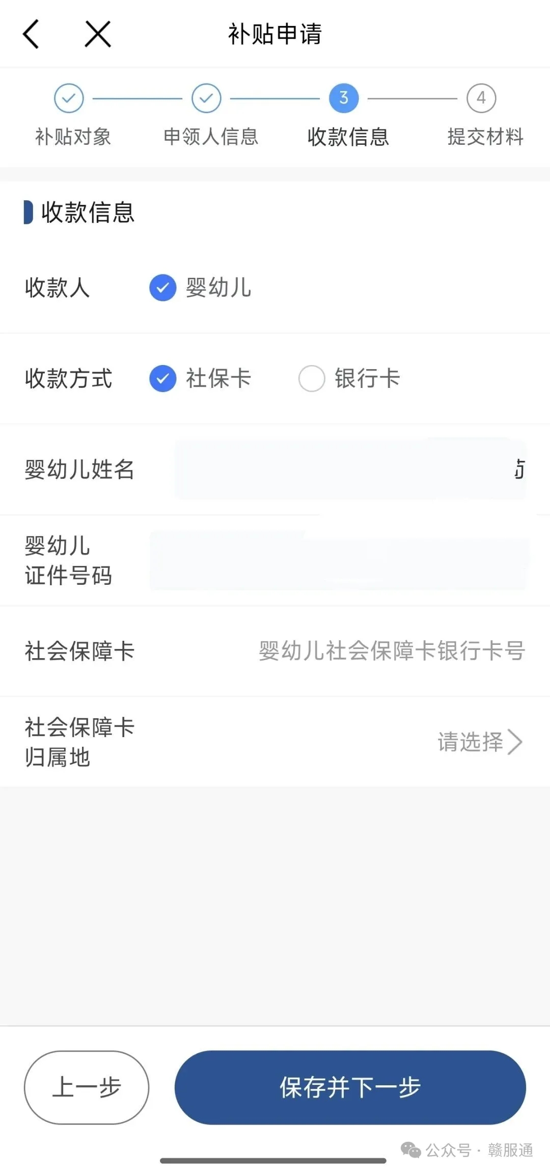 4.填写收款信息,上传出生医学证明、户口簿等材料,确认提交。