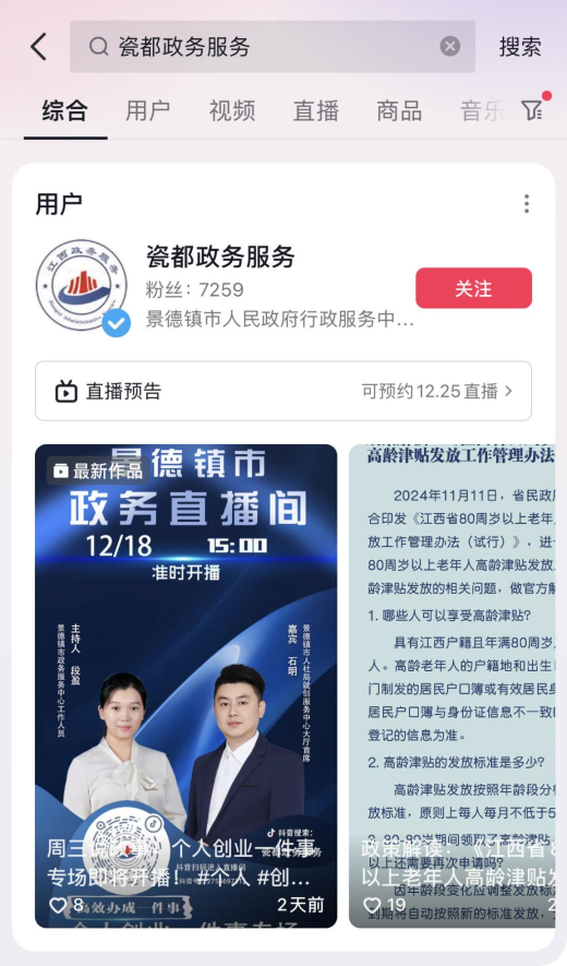 1、抖音搜索“瓷都政务服务”,点击关注,进入政务账号。