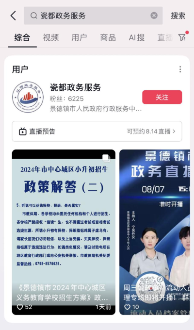 1、抖音搜索“瓷都政务服务”,点击关注,进入政务账号。