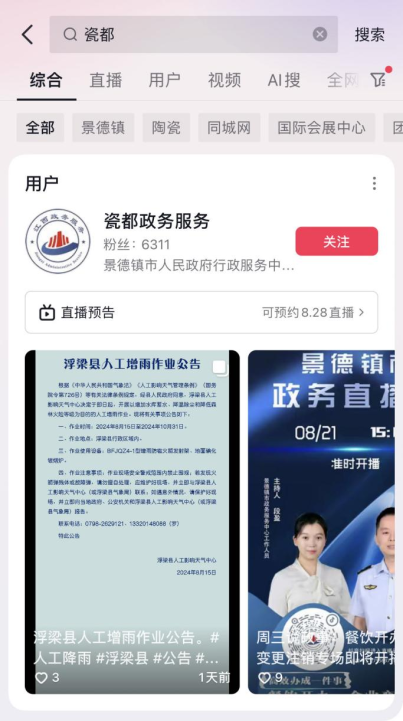 1、抖音搜索“瓷都政务服务”,点击关注,进入政务账号。