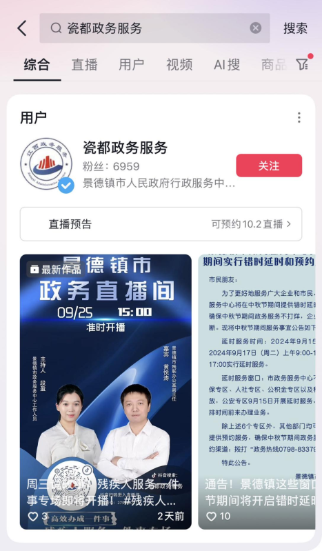 1、抖音搜索“瓷都政务服务”,点击关注,进入政务账号。
