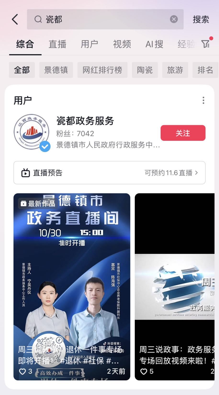 1、抖音搜索“瓷都政务服务”,点击关注,进入政务账号。