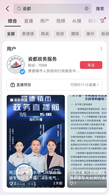1、抖音搜索“瓷都政务服务”,点击关注,进入政务账号。