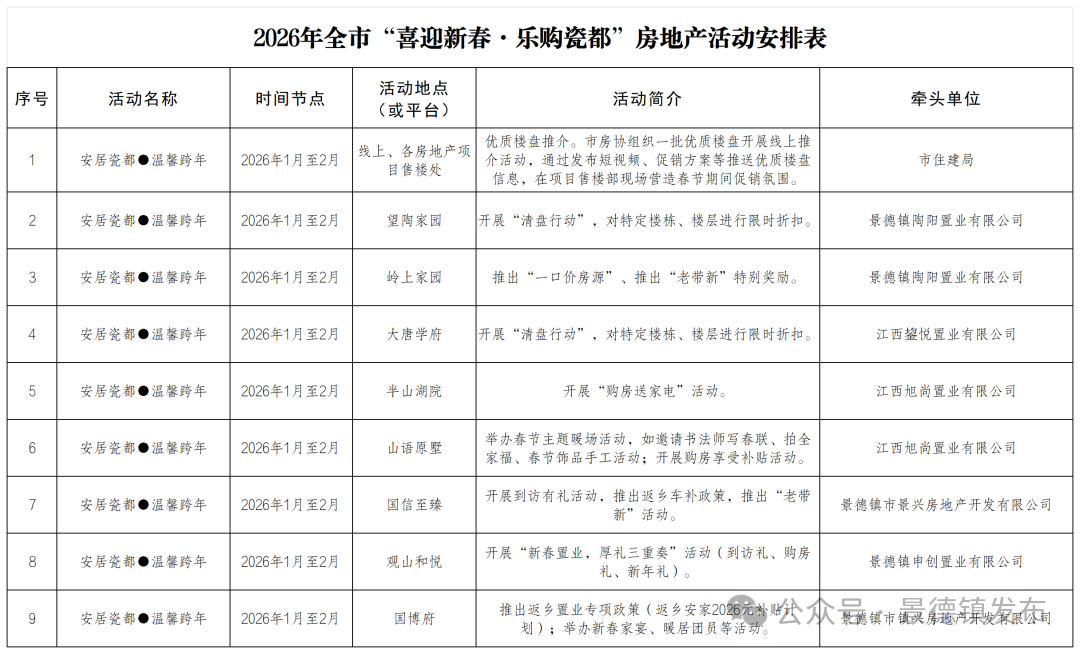 1月至2月期间,全市多家优质楼盘联动推出“安居瓷都·温馨跨年”主题活动,通过清盘特价、购房补贴、家电礼包、老带新奖励、返乡置业专项优惠等多重举措,满足居民安居需求。
