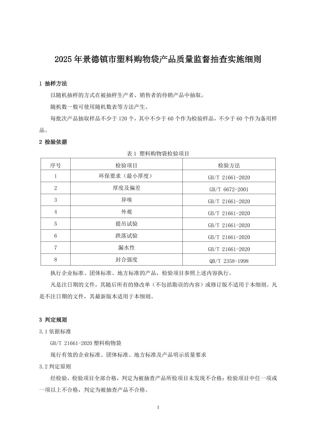 2025年景德镇市塑料购物袋产品质量监督抽查实施细则