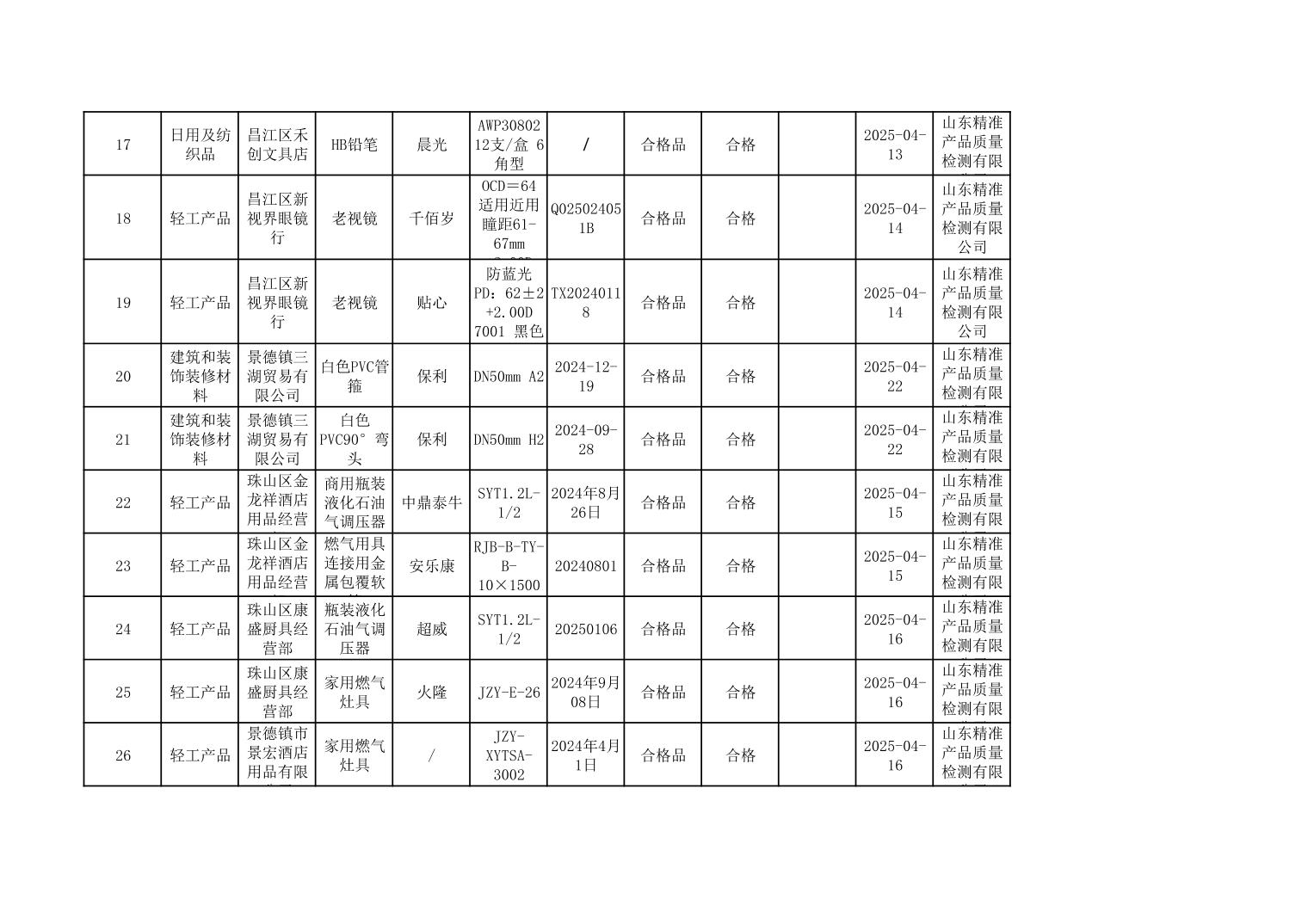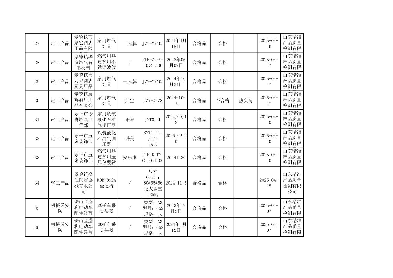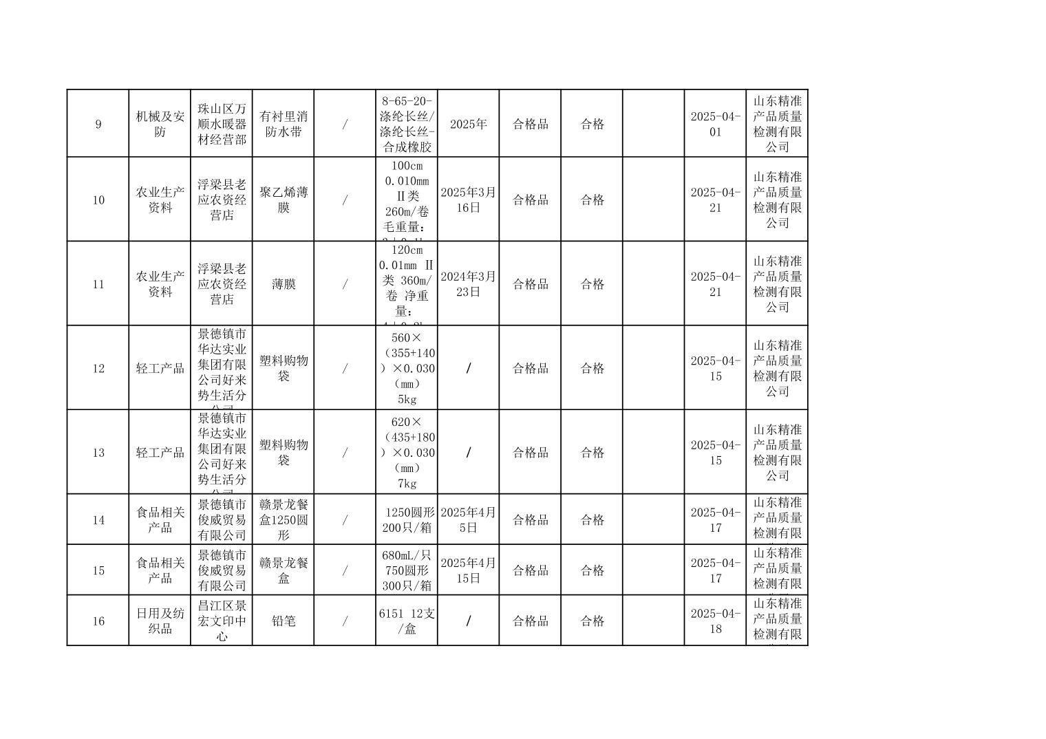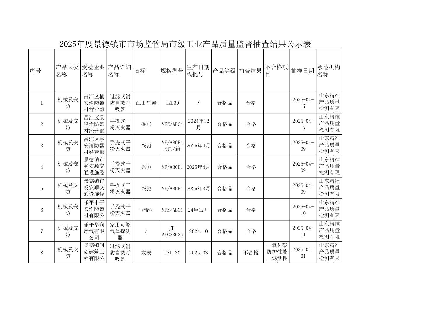 2025年度景德镇市市场监管局市级工业产品质量监督抽查结果公示表