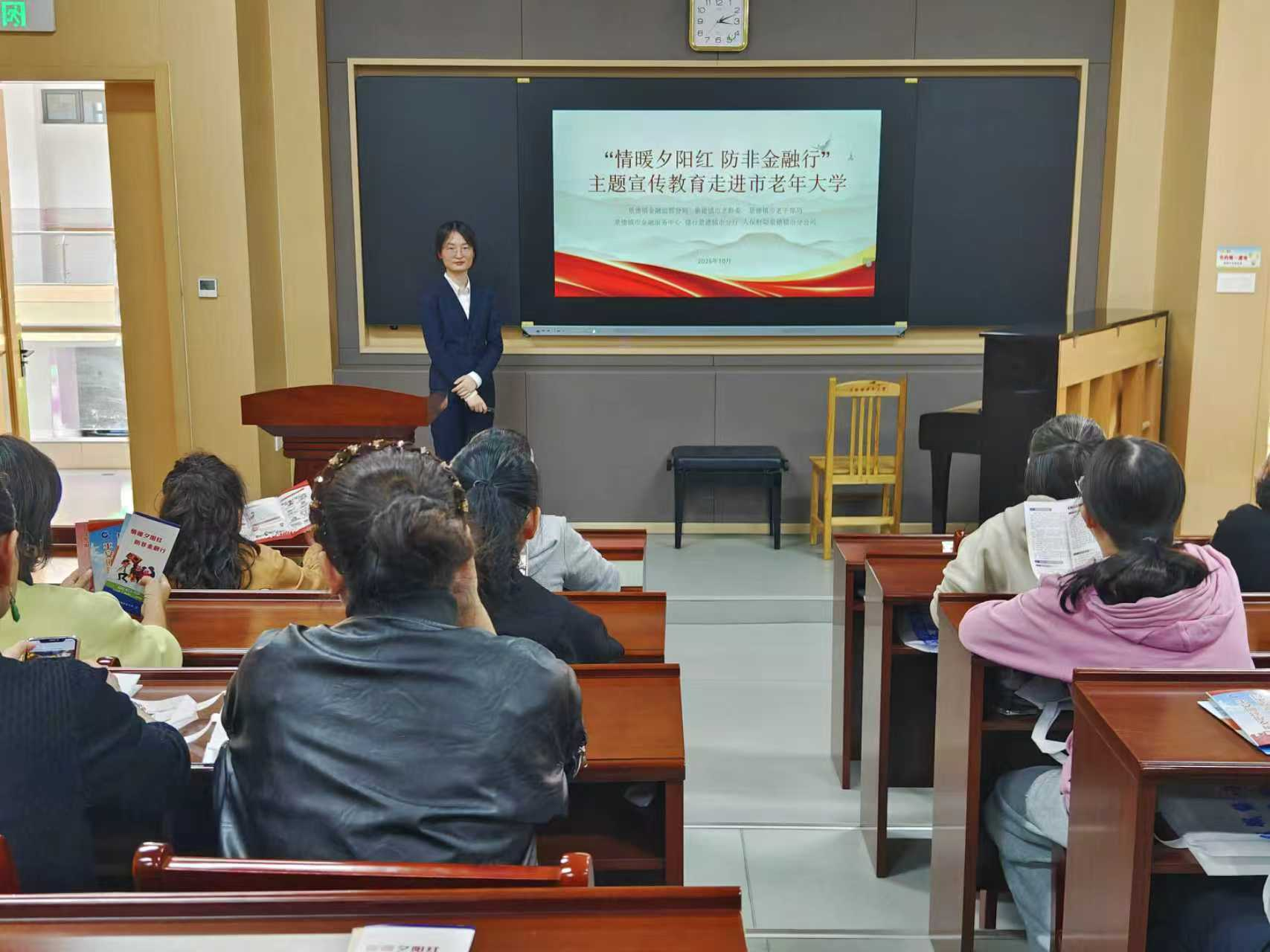 2025年10月29日,景德镇金融监管分局联合市金融服务中心、市老龄工作委员会、市老干部局开展“情暖夕阳红 防非金融行”主题宣传走进市老年大学。通过制作宣传折页、条幅,邀请律师开展法律专业课堂,设置开展情景游戏、问答互动、案例讲解等形式,深入浅出地讲述养老领域非法集资常见形式、危害影响等内容,提醒老年人注意瓷器收藏、陶瓷消费、字画古玩等领域非法金融活动,获得了老年人积极好评与点赞肯定。