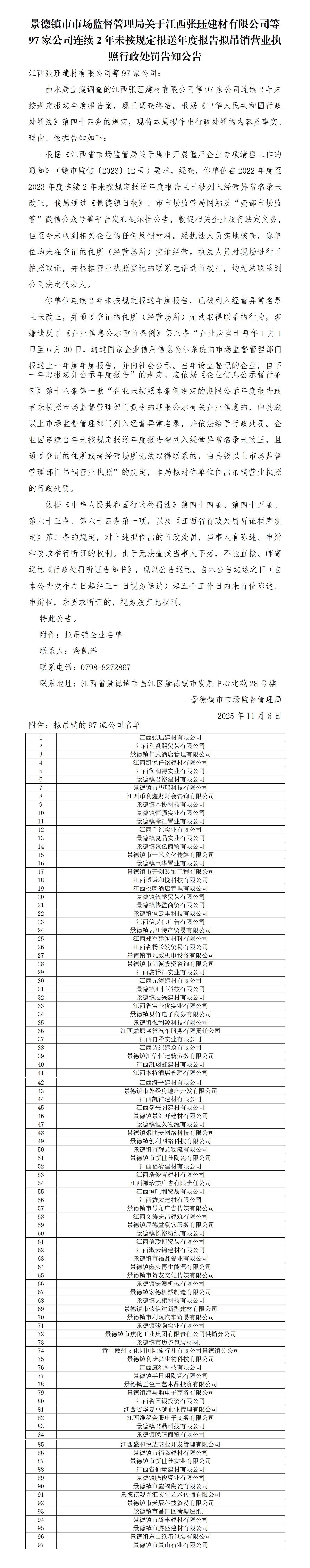 景德镇市市场监督管理局关于江西张珏建材有限公司等97家公司连续2年未按规定报送年度报告拟吊销营业执照行政处罚告知公告