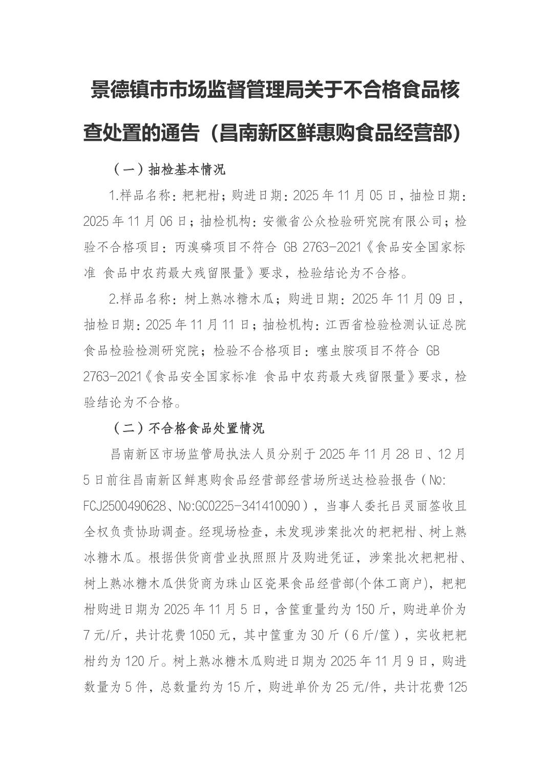 景德镇市市场监督管理局关于不合格食品核查处置的通告(昌南新区鲜惠购食品经营部)