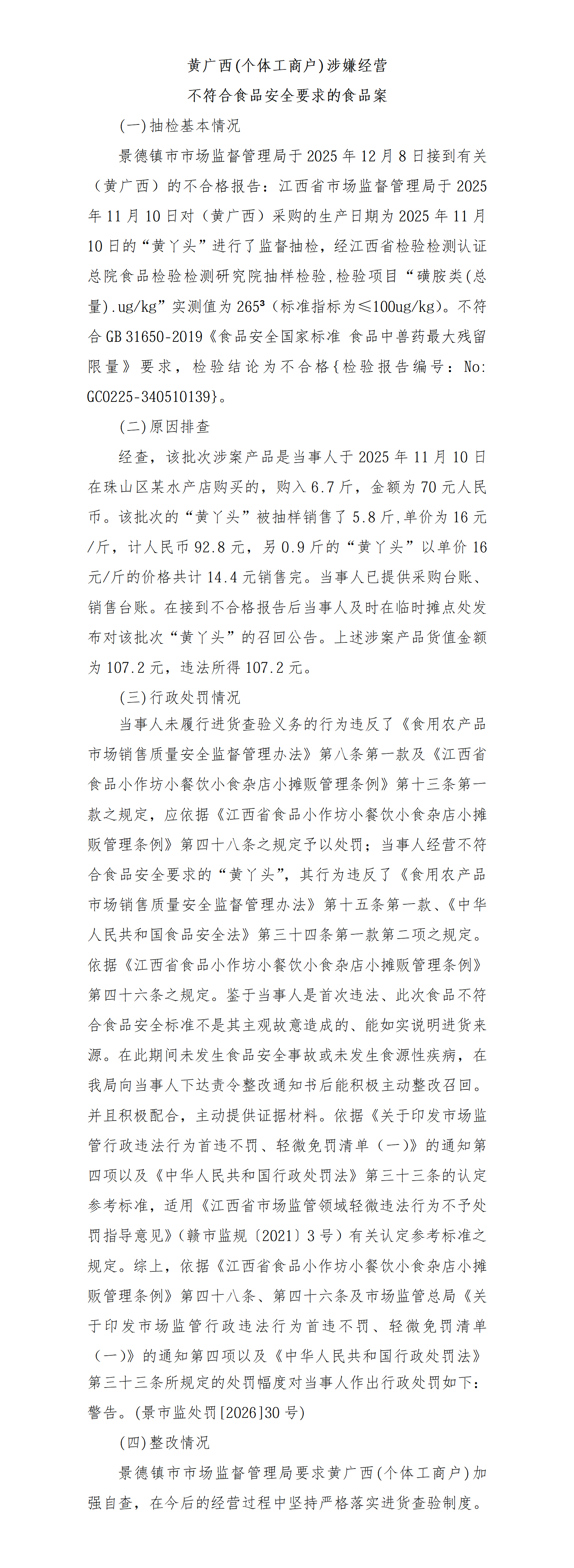 景德镇市市场监督管理局关于不合格食品核查处置的通告(黄广西)个体工商户