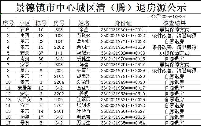 通过年审,经审核 安居苑,石岭,安泰,景东安厦,南河,历尧,安宇共有17户住房保障对象,因条件改善等原因自愿退出。依据《公共租赁住房管理办法》(住建部第11号令)、《关于加快发展公共租赁住房的指导意见》(建保【2010】87号)、《公共租赁住房管理办法》景府办发〔2023〕7 号等相关文件对保障房实行动态管理的要求,现对上述住房保障对象作出取消其相应住房保障资格的决定。