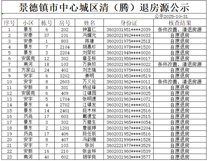 通过年审,经审核 ,安新,安居苑,安泰,安宇,方家山,景东安厦,南河,历尧共有23户住房保障对象,因条件改善等原因自愿退出。依据《公共租赁住房管理办法》(住建部第11号令)、《关于加快发展公共租赁住房的指导意见》(建保【2010】87号)、《公共租赁住房管理办法》景府办发〔2023〕7 号等相关文件对保障房实行动态管理的要求,现对上述住房保障对象作出取消其相应住房保障资格的决定。