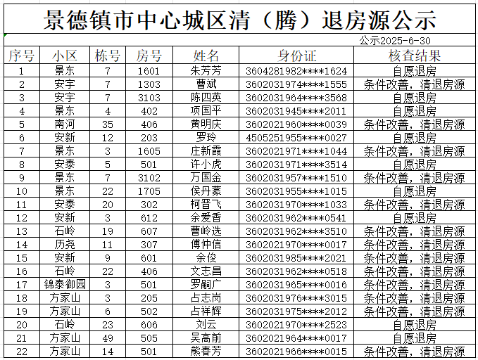 通过年审,经审核 ,安新,石岭,安泰,安宇,方家山,景东安厦,锦泰御园,历尧共有22户住房保障对象,因条件改善等原因自愿退出。依据《公共租赁住房管理办法》(住建部第11号令)、《关于加快发展公共租赁住房的指导意见》(建保【2010】87号)、《公共租赁住房管理办法》景府办发〔2023〕7 号等相关文件对保障房实行动态管理的要求,现对上述住房保障对象作出取消其相应住房保障资格的决定。