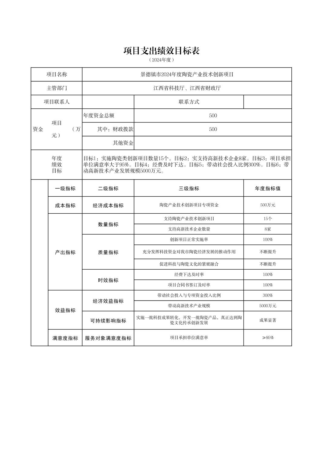 2024年度景德镇市陶瓷产业技术创新科技计划项目绩效目标表