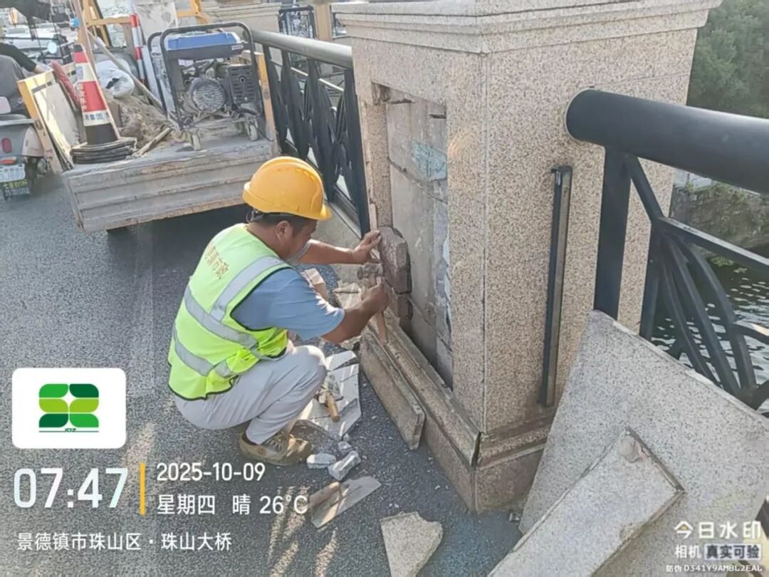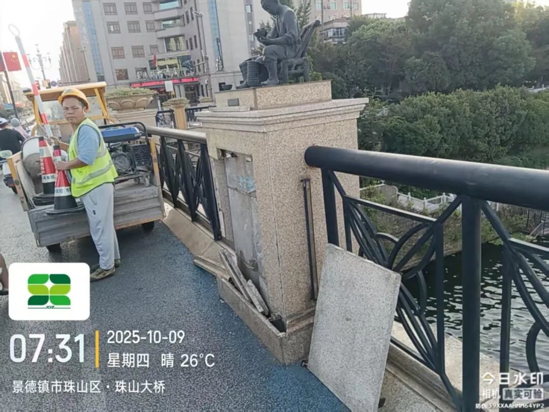 10月9日,养护一线巡查发现,珠山大桥一景观柱破损。市政公用集团及时进行修复,现已处理完毕,效果如下图所示。
