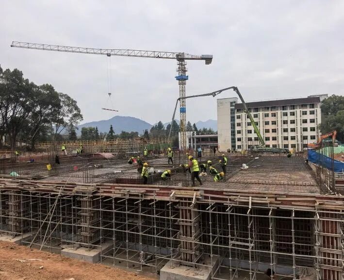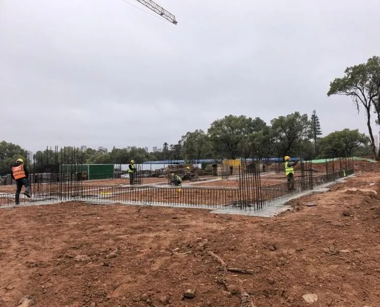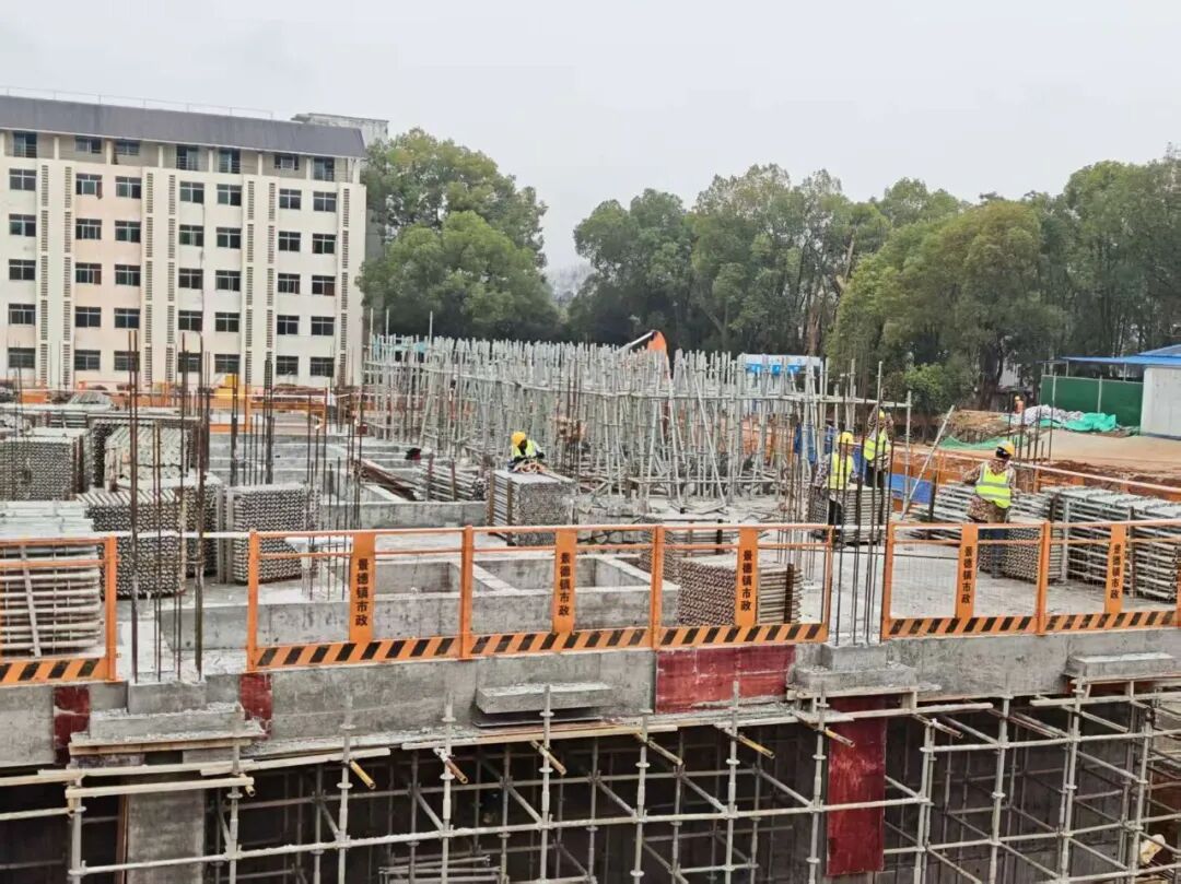 施工动态:目前正在进行项目基础及主体工程施工:图文信息楼东侧基础开挖、砖胎膜砌筑,中间地梁钢筋绑扎,西侧承台、地梁钢筋绑扎、混凝土浇筑;报告厅地下室顶板的梁板钢筋绑扎,墙柱、顶板混凝土浇筑;食堂基础梁混凝土浇筑,土方回填;新建宿舍首层混凝土浇筑,二层支模架搭设;保留宿舍贴砖、吊顶五层拆除完成50%;西北角挡土墙毛石混凝土浇筑、路基回填碾压等施工