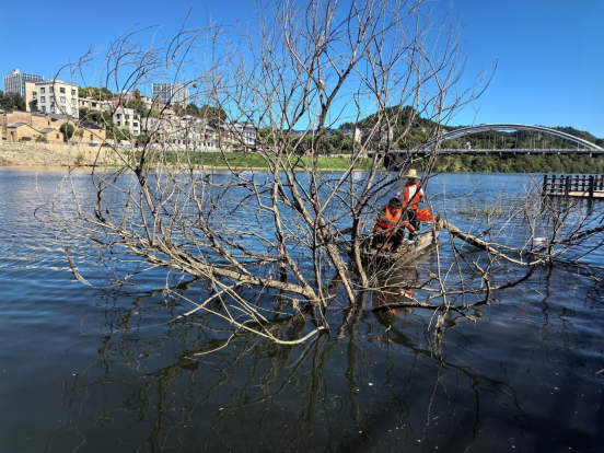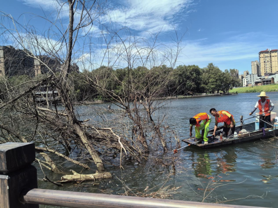 跨部门协同治河道,焕新文化遗产“生态风貌”。昌江河岸是景德镇历史文化的重要载体,近日,中心巡查发现昌江河道内枯树、断枝堆积,不仅破坏景观,还存在水流堵塞、水体污染等隐患,影响沿岸文化遗产保护与市民休闲环境。中心迅速联合市水利部门启动专项清理行动,水利部门依托水文数据划定重点清理河段,中心调派3艘专业打捞船、11名作业人员及2台清运车辆,采用“机械切割+人工打捞”方式,累计清理枯树23株、转运枯枝杂物约10吨。