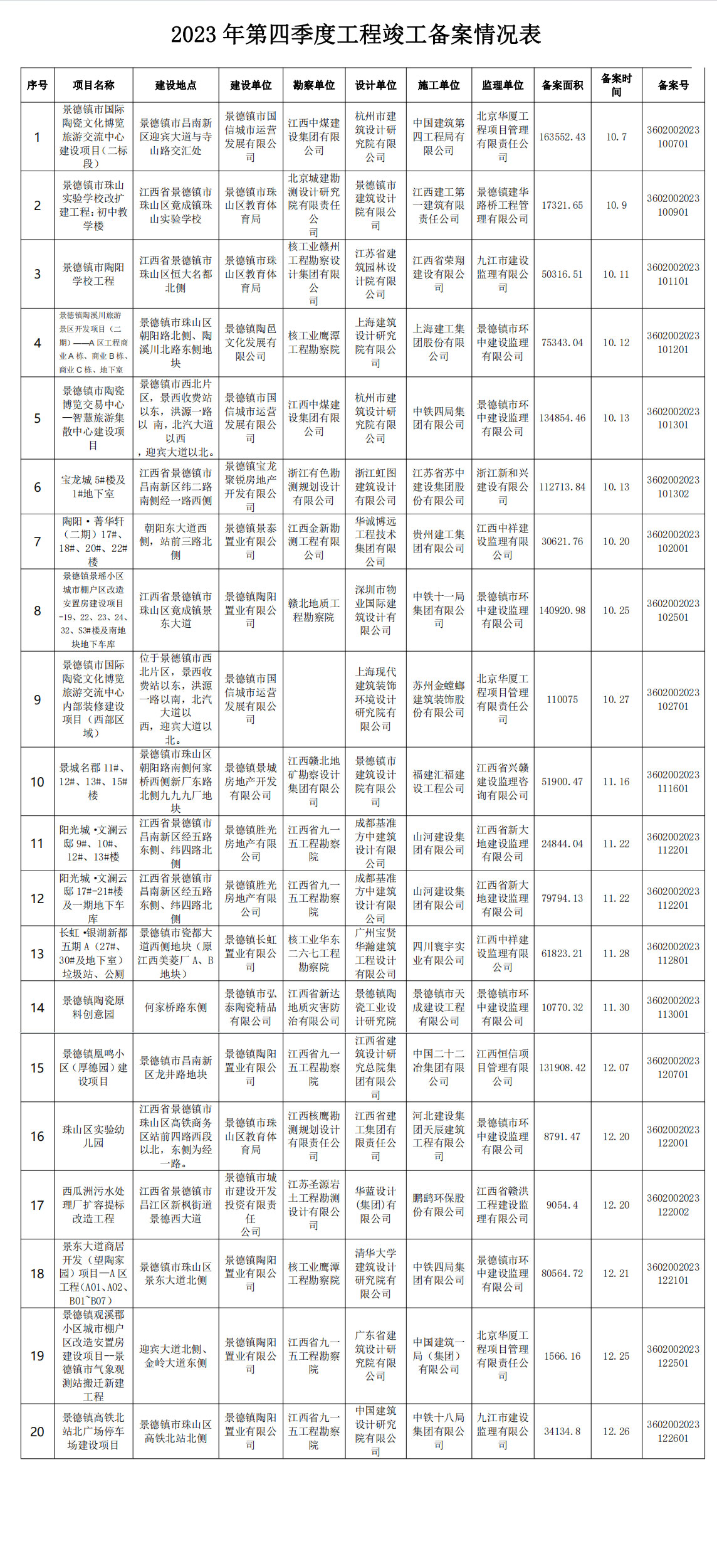 2023年第四季度工程竣工备案情况