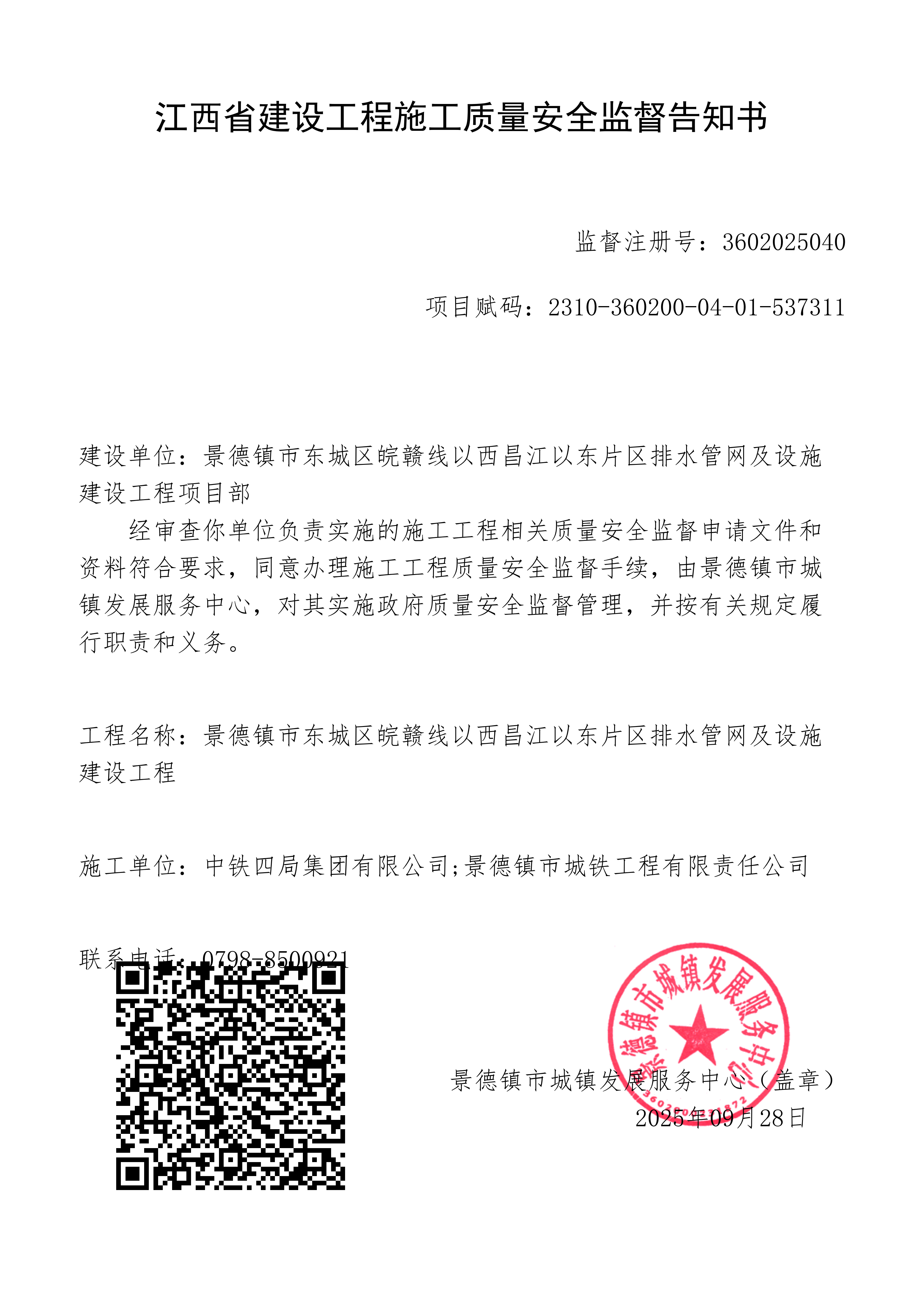 景德镇市东城区皖赣线以西昌江以东片区排水管网及设施建设工程施工建设工程质量安全监督告知书