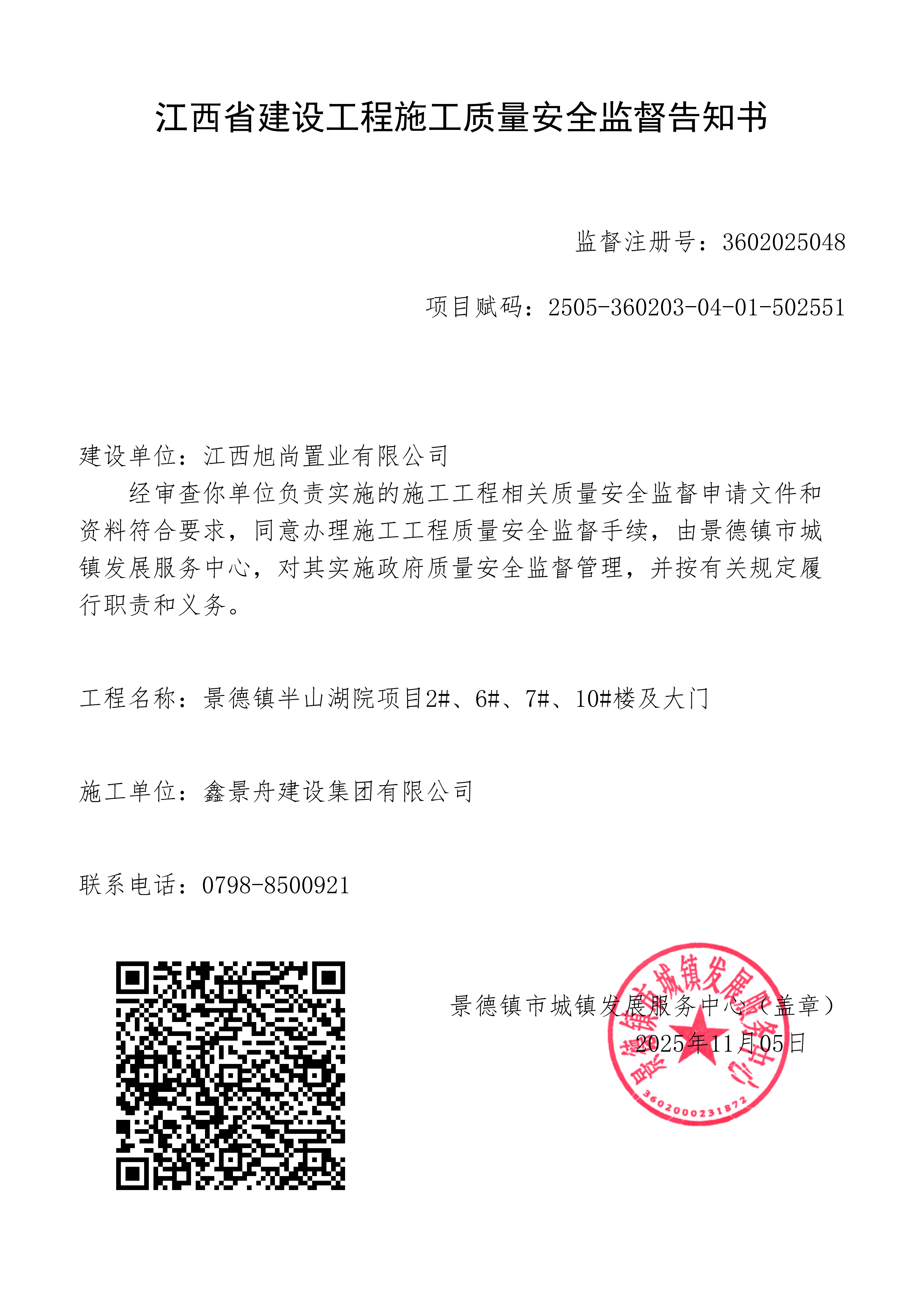 景德镇半山湖院项目2#、6#、7#、10#楼及大门建设工程施工质量安全监督告知书