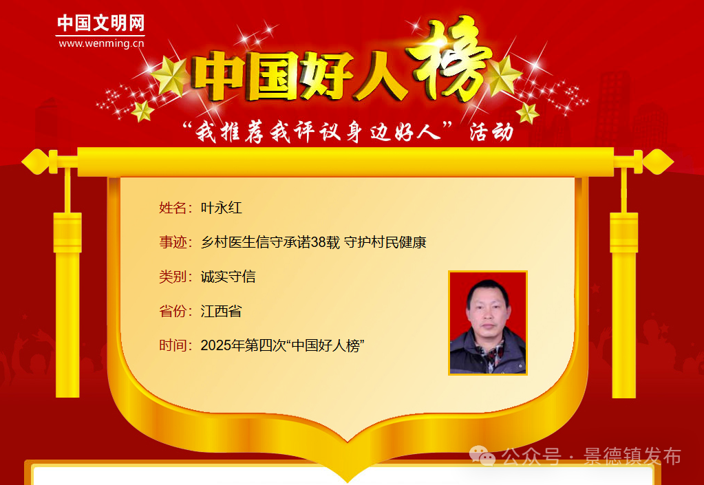 叶永红,男,1967年1月生,江西省景德镇市浮梁县王港乡高沙村村医。20岁取得乡村医生证书后,叶永红回到家乡开办诊所,让乡亲们看病不再奔波。在为困难户老范治病时,他承诺“只要我在村里,就给你看病。”此后,他将这份守护扩展到全村。38年来,他精心照料每位村民,累计诊治近10万人次。行医中坚持开“良心药方”,曾烧掉村民上万元赊账单据,以“不让患者多花一分钱”的诚信,成为乡亲们离不开的健康“守门人”。