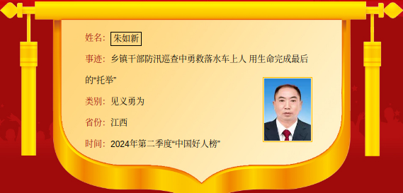 2022年6月20日,乐平市遭遇百年未遇的大洪水,乐安江建节河段水位飞速上涨,最高峰时超警戒线4米多,朱如新带领分管的党员干部冲锋在抗洪抢险的最前线。转移群众时,因人太多,梯子不够用,有几名群众被困于楼上,朱如新主动俯下身子,用身躯做人梯让救援队友爬上楼实施营救。