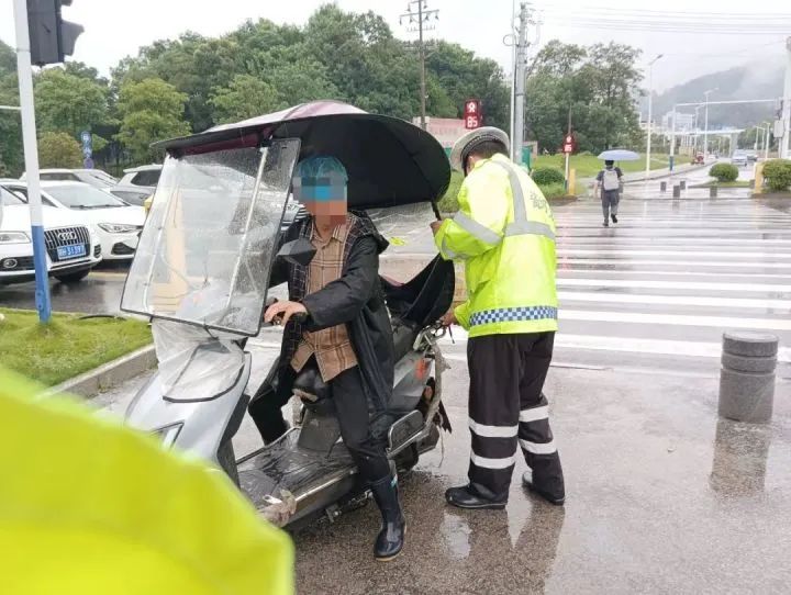 雨下个不停,让许多骑电动车的市民又惦记起了雨棚,不少电动车、摩托车驾驶人抱着图方便、侥幸的心理,驾驶加装了雨棚的电动车、摩托车出行。为消除电动车加装伞棚的不安全行为,市公安局交警支队三大队新厂中队采用拆棚送雨衣的人性化执法方式,暖心的举动也得到了广大群众的认可。
