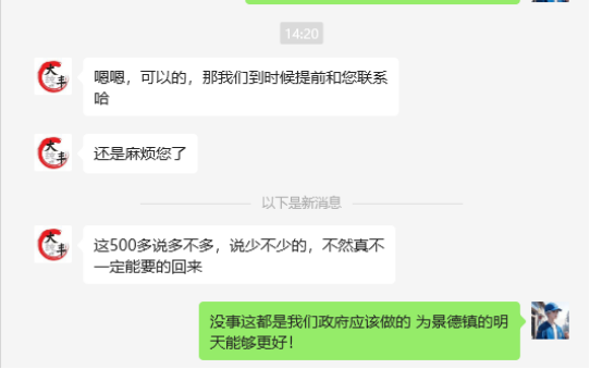 “你好,因为本人有突发状况临时改变行程,麻烦你们能帮我协调预订酒店全额退款吗?”这是10月5日,新疆伊犁计划来景旅游的马女士通过12345热线向景德镇市珠山区诚信退赔专班求助,希望能全额退回酒店的预付款。了解情况后,专班和属地工作人员第一时间和求助人取得联系,并赶赴相关酒店进行协调,通过积极沟通,商家愿意全额退款,马女士感受到了专班快速、积极解决问题的能力和服务,通过微信表达对专班工作的肯定,表示下次有空一定会来景德镇。