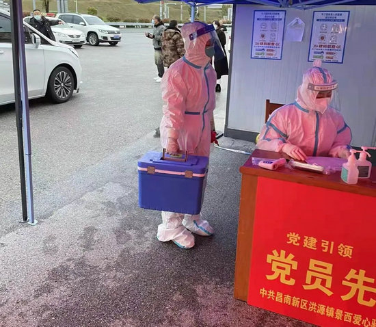 市疾控中心党员志愿者在昌南新区洪源镇景西爱心驿站接收核酸检测样本。