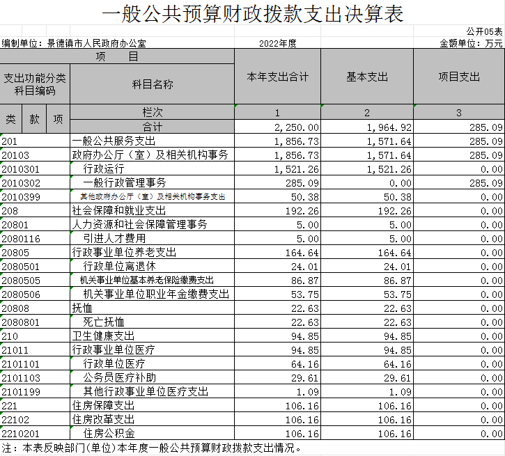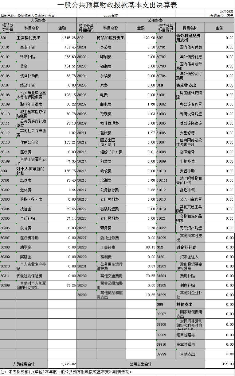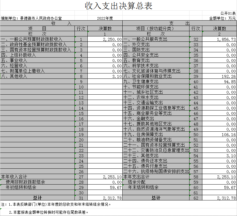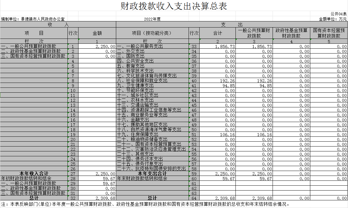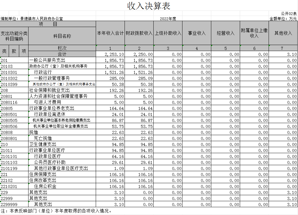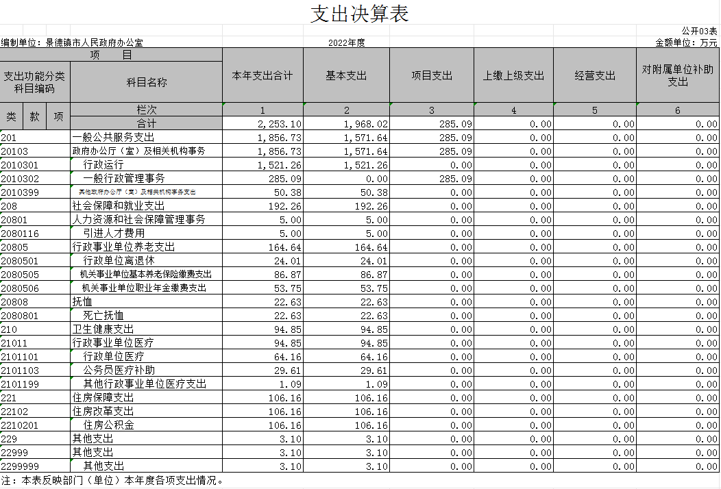 2022年景德镇市人民政府办公室预算调整后预算收入共计2312.78万元,2022年实际已支付2253.10万元,预算执行率为97.42%。