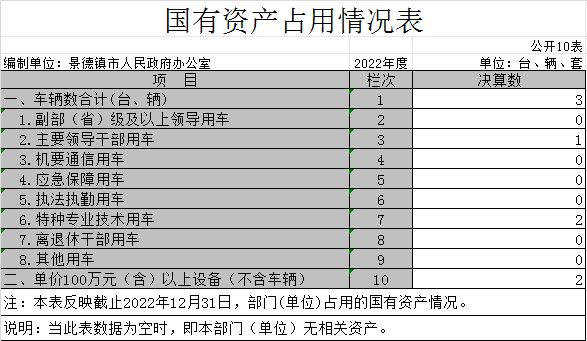 截止2022年12月31日,本部门国有资产占用情况见公开10表《国有资产占用情况表》。其中,副部(省)级及以上领导用车0辆、主要领导干部用车1辆、机要通信用车0辆、应急保障用车0辆、执法执勤用车0辆、特种专业技术用车2辆、离退休干部用车0辆、其他用车0辆;单位价值50万元以上通用设备1台(套);单位价值100万元以上专用设备2台(套)。