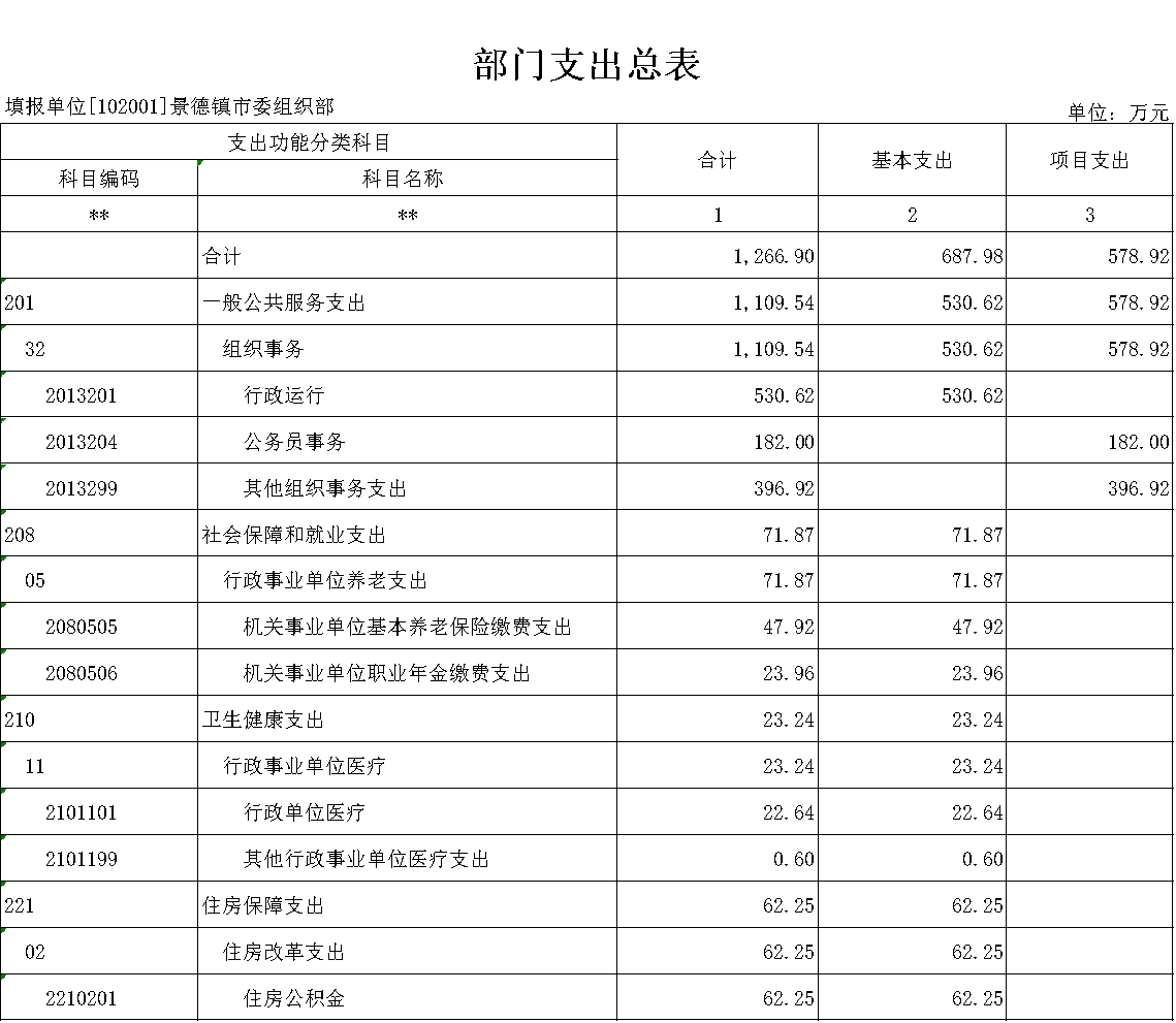 按支出功能科目划分:一般公共服务支出1109.54万元,社会保障和就业支出71.87万元,卫生健康支出23.24万元,住房保障支出62.25万元。